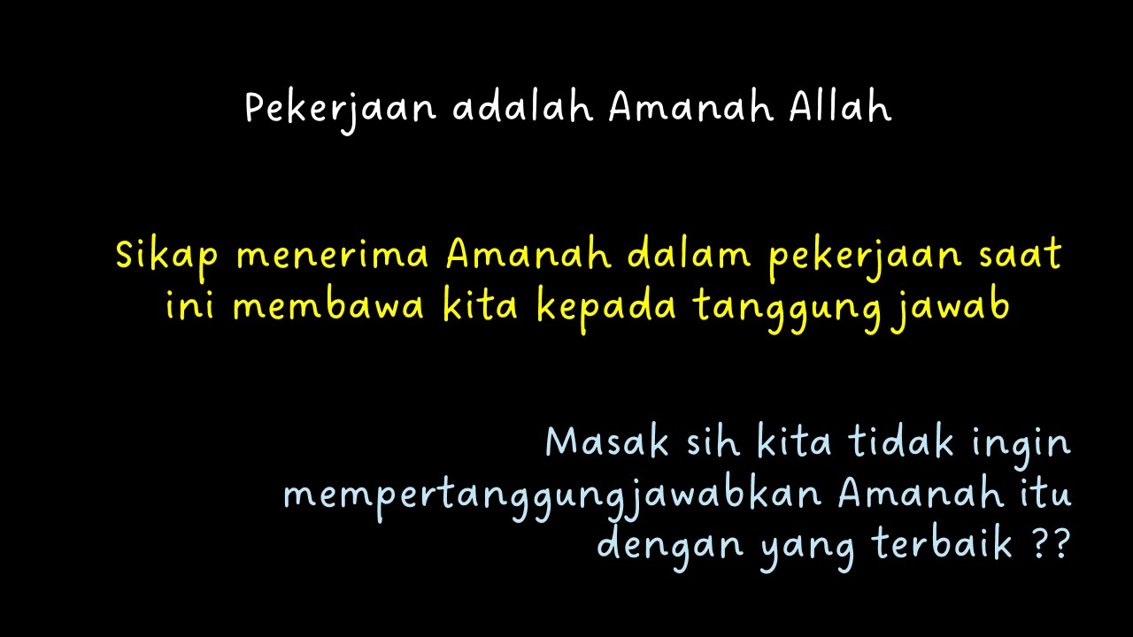 Apa yang mesti kita lakukan ? Yang pertama apapun pekerjaan kita adalah amanah. Amanah yang diizinkan Allah kepada kita, dimana kita mengemban khalifah dibumi ini, dimana pekerjaan sekarang merupakan amanah (menjadi wakil Allah). Kok bisa ? Kalau kita tidak diterima perusahaan, maka pekerjaan yang kita lamar bukanlah amanah kita. Disisi lain, kita diterima di perusahaan tapi tak berapa lama kita pindah atau tidak dibutuhkan, ini menunjukkan pekerjaan itu bukan juga amanah Allah. Amanah itu melekat pada perusahaan dengan pekerjaannya. Amanah Allah, itu menunjukkan kita mesti mempertanggungjawabkan juga kepada Allah. Bagaimana dengan atasan dan perusahaan ? Mempertanggungjawabkan kepada Allah sudah pasti melewati pertanggungjawabkan kita kepada atasan dan perusahaan. Kita mesti melakukan pekerjaan yang terbaik yang kita miliki dengan ilmu yang terus berkembang dan tidak ada tindakan (kerja) yang tidak baik atau tidak bertanggung jawab. Jika kita mampu mengemban amanah Allah dan bertanggung jawab, maka kita pun bisa memberi kerja yang benar kepada atasan dan perusahaan.